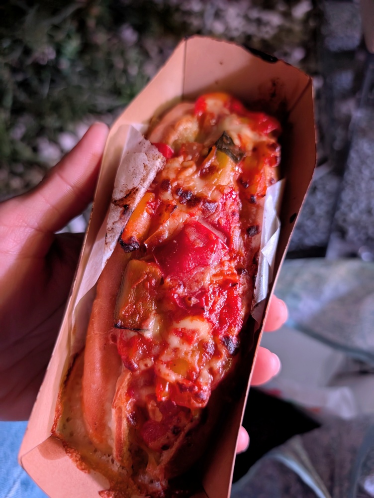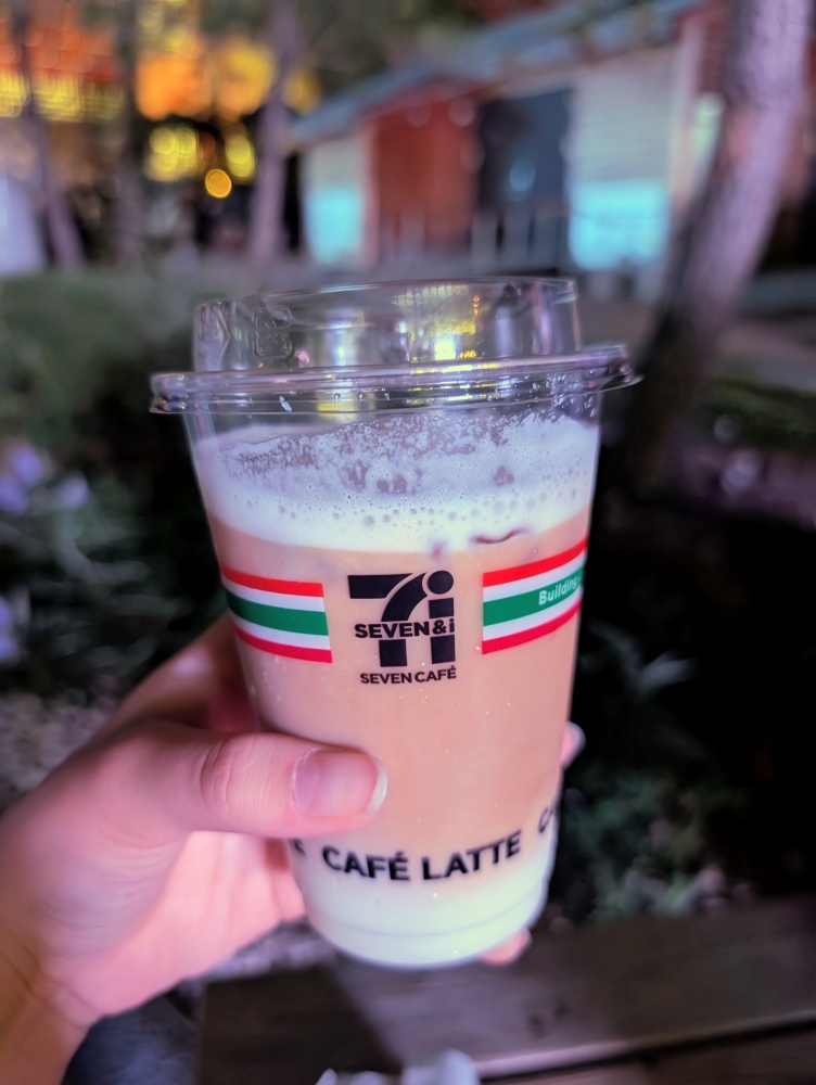 万博限定のセブンイレブンの出来立て商品のホットドック、マシンで淹れるミルクティーを飲食して、