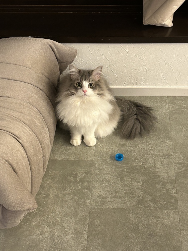 お気に入りのペットボトルの蓋の青いキャップのおもちゃで夢中になって遊んでいます。